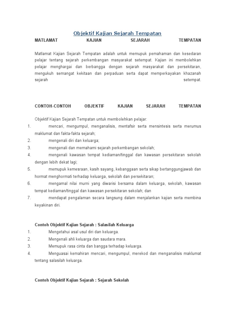 Contoh objektif kajian tugasan sejarah pt3 2020|panduan buat anda calon tingkatan 3 yang bakal menduduki peperiksaan pt3 tahun 2020. Anda dikehendaki membuat kajian berkaitan penentangan tokoh tempatan di negeri anda. Memastikan data yang diperoleh dapat mencapai objektif kajian dan menjawab pernyataan masalah. Dalam kajian sejarah sosial tentu juga tidak lepas dari metode, adapun metode yang digunakan dalam penelitian sejarah sosial adalah metode sejarah. (ii) membina objektif yang jelas agar mudah dicapai.